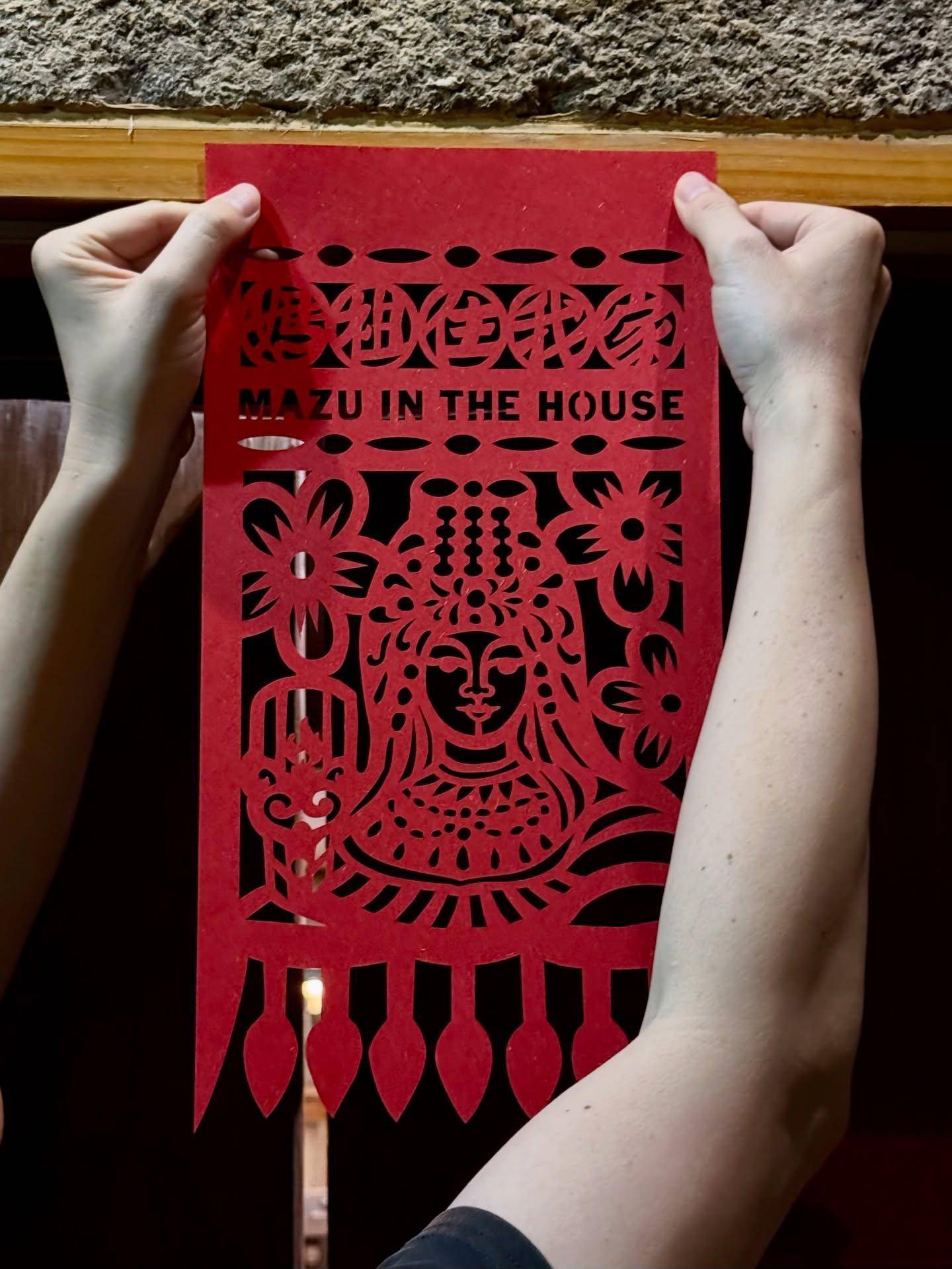 將朱朱的手繪媽祖以剪紙的意象呈現,製成的福符,聖母媽祖手持火燈,光明照耀人間,佐以英文「Mazu in the house 」,象徵著媽祖的祝福在新的一年,「后符臨門」降臨家中!張貼門上、窗口,帶來一整年的庇佑。